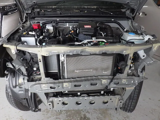 今回は、大阪市にお住まいのお客様からのご依頼で、スズキ・ジムニーの前回り追突事故修理になります。フロントバンパーが変形していますね。これは部品交換での修理しかないですが、新品部品での修理だと値段も高くなってしまいます。