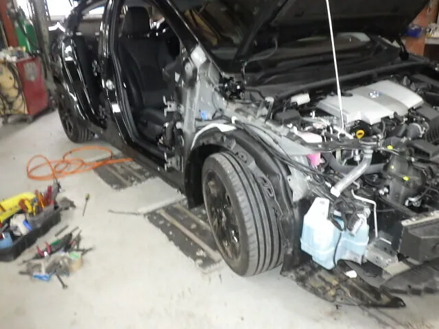 付属品パーツを分解し交換必要部品等をチェックし、なるべく使える部品を再使用し費用を少しでもお客様のご負担を減らしエコ修理を目指しつつ綺麗に修理をさせてもらう旅の途中となります!フロントバンパー交換、右ヘッドランプ交換、ボンネットアルミパネル修理、右フロントフェンダー交換右フロントドア交換右リアドア交換、右リアフェンダー交換、リアバンパー交換、フロントピラー修正修理、ミラーカバー交換、サイドシルカバー脱着、室内内張等付属品脱着、塗装ブースにて全面塗装、基本アルミパネルは交換となりますが状況にて修理実施!無料代車提供あり!